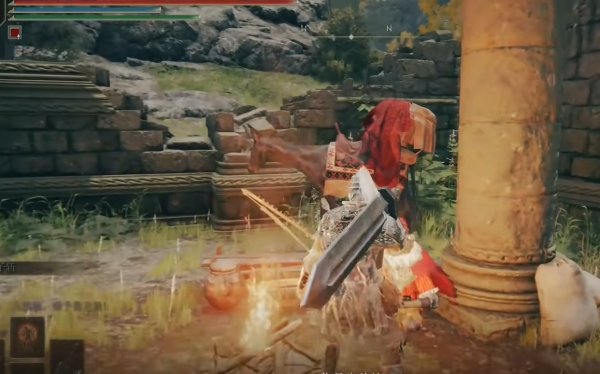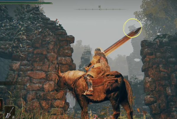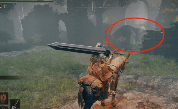 10、来到“雾林废墟”附近,我们不要向里面走,要绕到后面去,能看到有一只“卢恩熊”趴在“地下室”的入口处