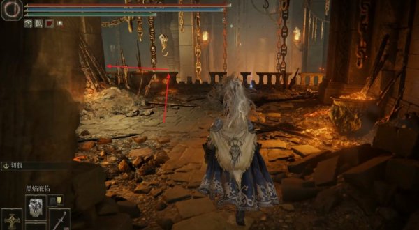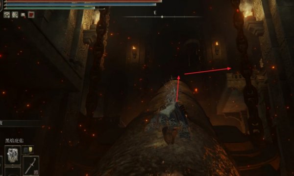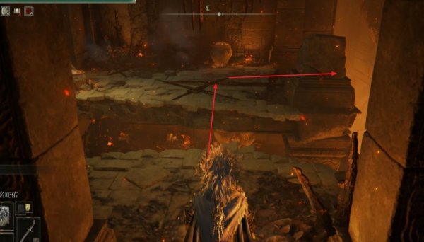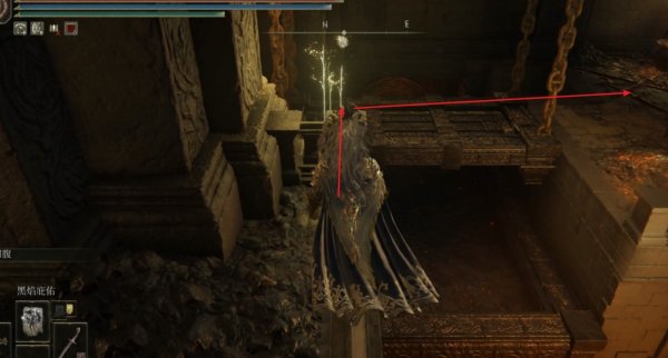 3、从泰乌尔锻造遗迹的赐福出发往前走,先走到前方尽头的栅栏处,此时跳到栅栏上往左走。
