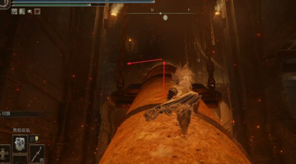 6、沿着柱子往上走到尽头,然后往右跳到靠下的位置,注意左侧是一个低平台,右侧是一个高平台,我们需要跳到左侧的低平台然后往前走。