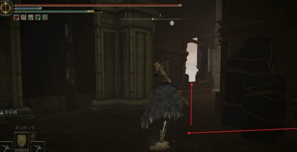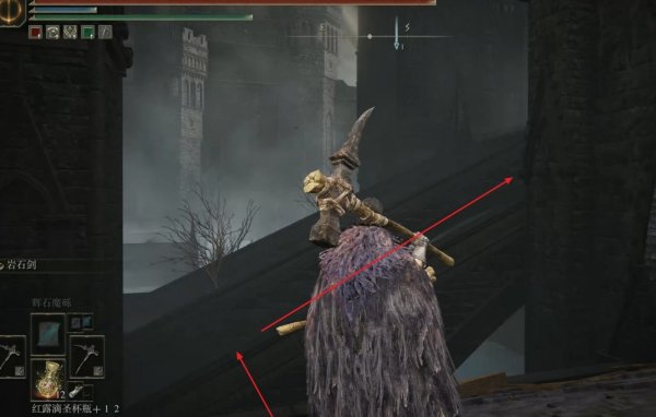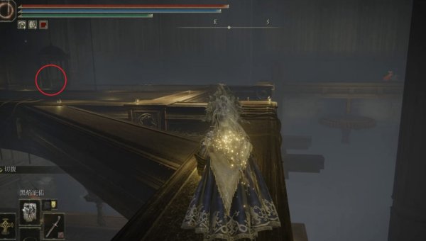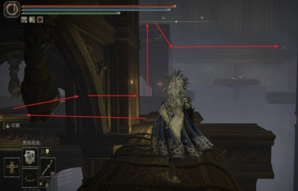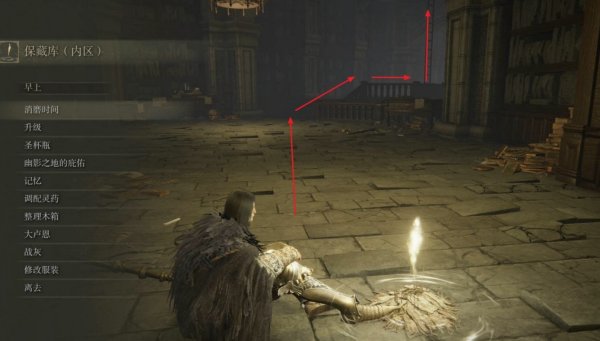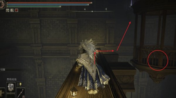 11、爬到第三层的位置,先走到前方小门的位置,此时往右后方看,通过此处的出口走到外侧楼梯,沿着楼梯爬到上层激活赐福【保藏库(阁楼)】。