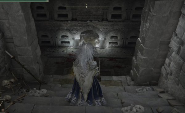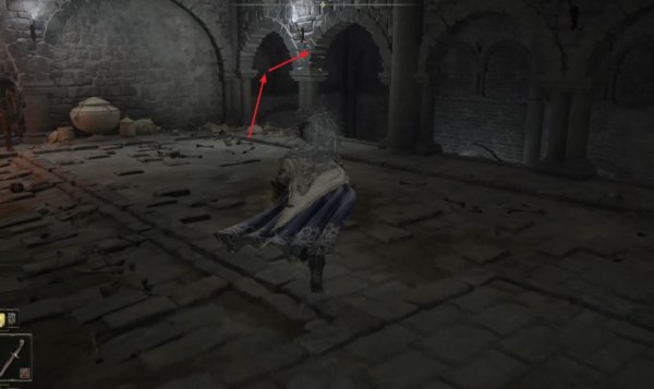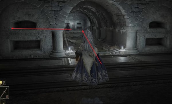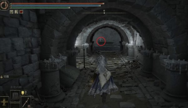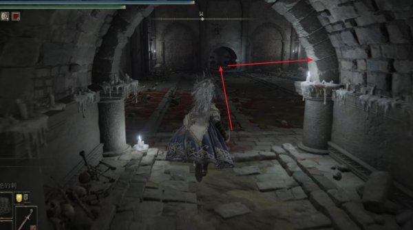 2、从地下墓地的赐福开始,先往前走一段距离然后左拐,注意这个房间上方的尖刺陷阱。