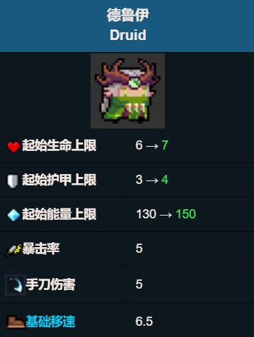 德鲁伊拥有较高的生命上限和手刀伤害,但护甲和能量上限都较低。其初始武器嘎嘣脆的骨头输出和自保能力都极其低下,无法给予任何帮助,而其被动随从强化对技能和宠物随从都有直接加成,这些决定了他会十分依赖友军的输出和牵制来减轻自身的压力。