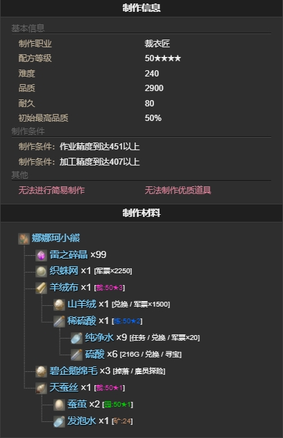 雷之碎晶×99、织蛛网×1、羊绒布×1、碧企鹅绵毛×3、天蚕丝×1