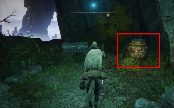 2、从赐福出发沿着坡道向上一直走进入村子,可以在石棺旁找到一个发黄光的罐子。