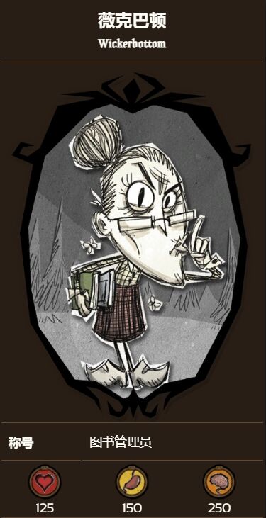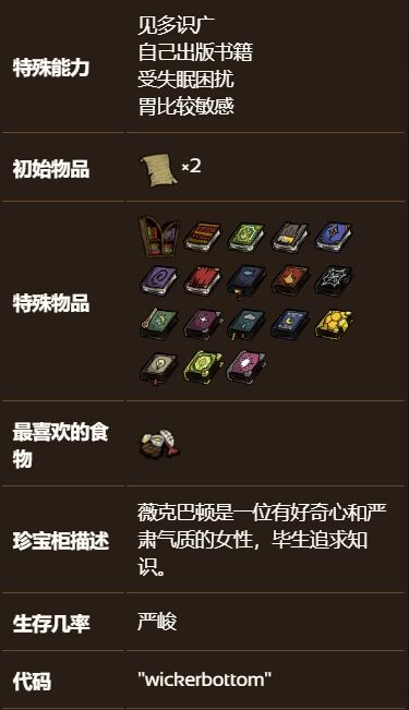 薇克巴顿的主要能力在于她可以制作特殊的魔法书,她可以通过消耗理智阅读它们来产生各种效果。