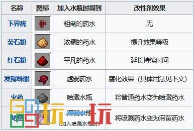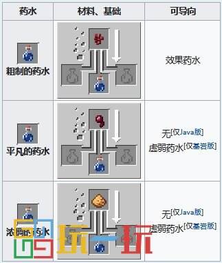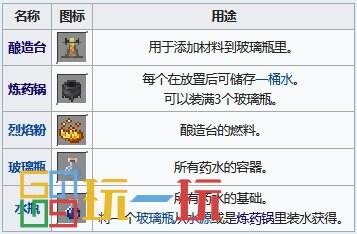 基础材料是直接加入水瓶的材料,是所有药水的起点。下界疣是此阶段的最基本材料,需要用它来制作绝大多数的药水。