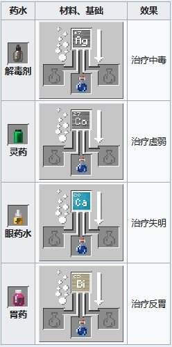 药物可由粗制的药水加入不同的元素[仅基岩版和教育版]酿造成。这些饮品在喝下后可以去除特定的效果,并且不能被改为喷溅、滞留、增强、延长的版本。