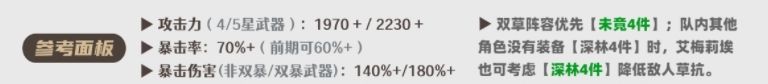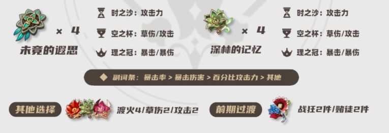 深林套:作为草系站场输出角色,深林套能显著提升调香师的伤害输出,主要词条可选择攻击力和元素精通。