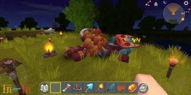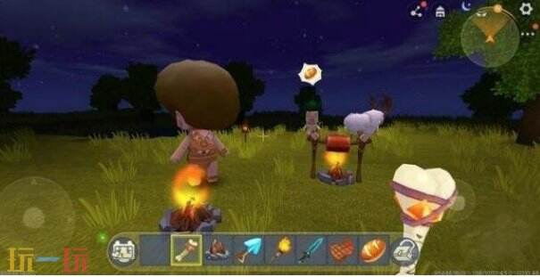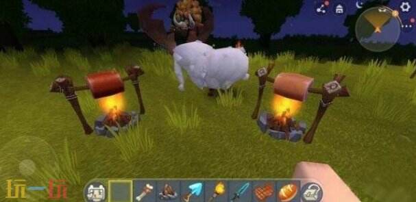 1、因为野人是在晚上的时候才会出现,所以我们先要等到晚上,然后将篝火放在地上,用火炬将篝火点燃,点燃篝火后在上面放上生肉进行烧烤。