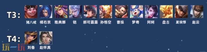 T3梯队:猪八戒、橘右京、雅典娜、铠、娜可露露、孙悟空、曹操、梦奇、阿轲、盘古、夏侯惇、赵云