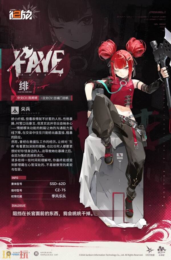 娇小纤细、但看表情就不好惹的人形。性格暴躁,时常口出暴言,但其实这并非出自她本心——情绪模块功能的削弱让她的沟通能力直线下降,在交谈中往往只能给出最直接、粗暴的回应。