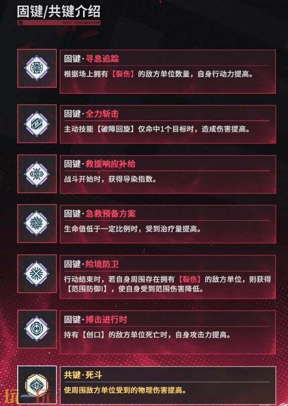 对自身周围所有拥有【裂伤]的敌方单位施加【创口],拥有【创口]的敌方单位行动结束时,会受到固定伤害。