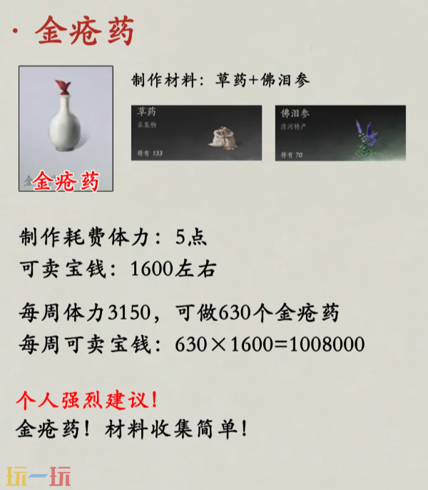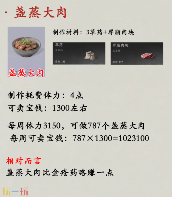 相对而言,盏蒸大肉比金疮药略赚一点,但金疮药的材料收集更为简单,玩家可以根据自己的实际情况选择制作。
