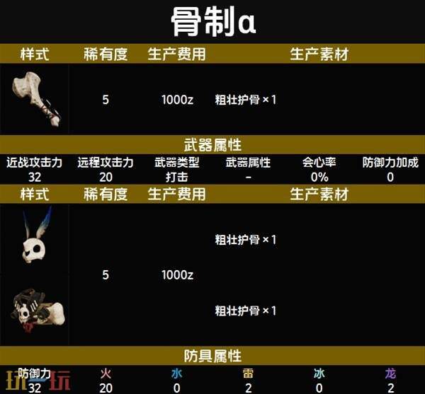 怪物猎人荒野随从猫骨制α套装数据与材料如下: